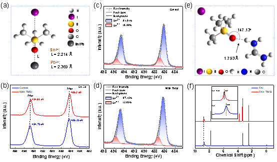 在钙钛矿中用锡取代部分铅,一方面可以降低毒性,另一方面可以降低带隙,潜在的改善器件性能。然而,锡铅钙钛矿结晶速度快、 Sn2+易被氧化成Sn4+,使得锡铅合金钙钛矿薄膜的体相和表面产生很多缺陷,从而导致钙钛矿太阳能电池器件的不稳定性问题。鉴于此,周忠敏团队和合作者将含有亚砜基团的有机小分子三甲基碘化亚砜(TMSI)作为添加剂和氟化亚锡(SnF2)同时引入锡铅合金钙钛矿前驱体溶液中,以调节钙钛矿薄膜的结晶,制备高质量的钙钛矿薄膜。我们通过密度泛函理论(DFT)和核磁共振氢谱(1H NMR)分析了TMSI与钙钛矿的相互作用,并且通过XPS 表明TMSI的引入抑制了Sn2+的氧化。
