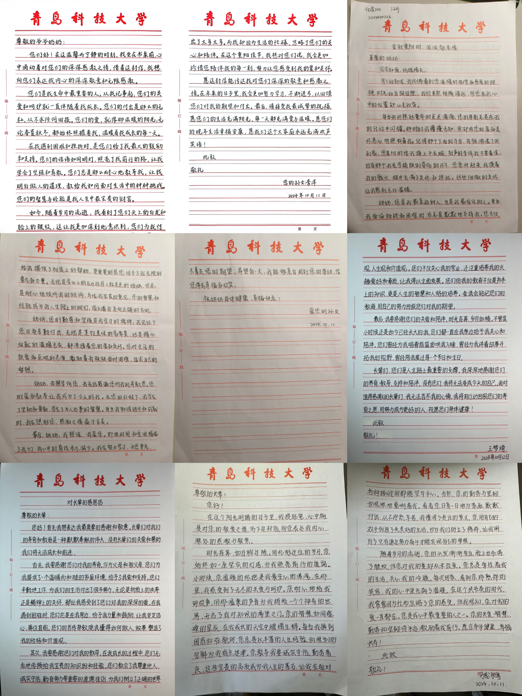 15vip太阳成小分子志愿服务队组织15vip太阳成全体学生发挥各自专长,以录制视频、撰写书信、绘制手抄报或制作PPT等多种创新方式,向家中的长辈表达了深切的感恩之情、向学校的离退休教师以及养老院的老人们传递了温馨的节日祝福和深切的关怀。这些作品不仅充满了同学们的才华与创意,更蕴含着对长辈们无私奉献和辛勤付出的深深敬意。活动结束后,评审负责人通过提交作品认真筛选评审,从整体考虑作品的创意、情感表达以及制作质量等方面进行综合评估,最终刊登合格作品和优秀作品。
