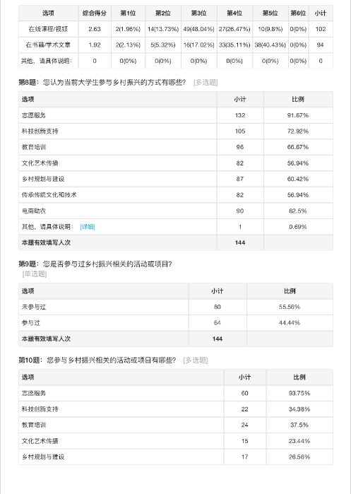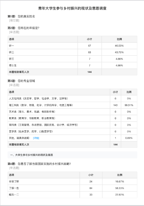 调查过程中,研究生团队开展了问卷调查、访谈等多种形式的调研活动,收集了大量具有代表性的意见和数据。调查结果揭示了当前青年大学生在乡村振兴方面的参与情况,并深入分析了影响大学生参与意愿的主要因素。这些宝贵的调查数据为政策制定者在制定和优化乡村振兴相关措施时提供了重要参考。同时,此次调查活动也极大地提高了大学生群体对乡村振兴战略的认知度和参与热情。
