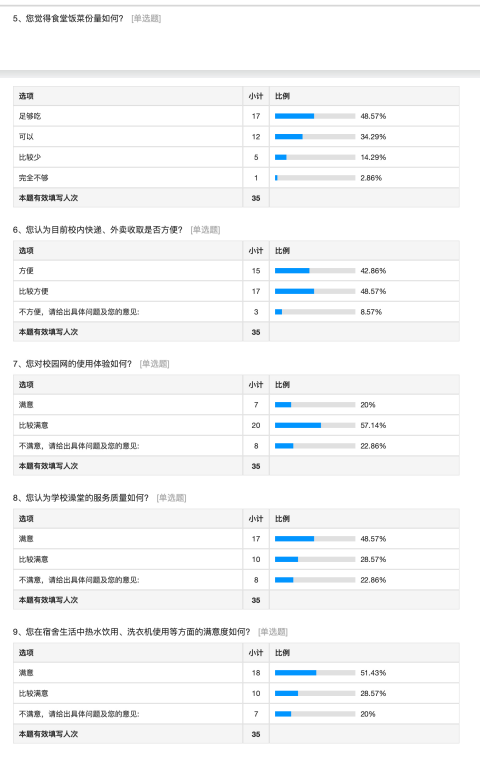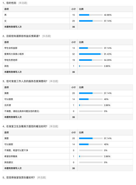 此次调研活动共收获了35份问卷。通过对调研结果的分析,形成一份详实的调研报告。我们切实掌握学生在校园各个方面的权益状况和诉求,从“希望增加专业书籍的借阅量”到“建议改善实验室通风条件”,从“期望举办更多跨学科交流活动”到“关注心理健康服务资源的普及”。