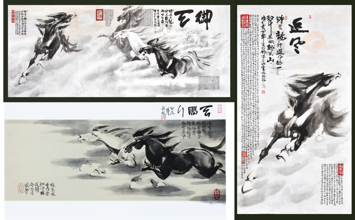在随后的讲座环节,最令人瞩目的环节当属现场创作展示。祝先生铺开丈二宣纸,以气运笔、挥毫泼墨,顷刻间完成三幅蕴含深意的书法作品——“梧凤之鸣”寄托对青年才俊的期许,“海大纳百川”勉励学子兼容并蓄,“精气神”三字则笔力千钧,强调治学当有浩然之气。压轴时刻,祝先生即兴创作《骏马图》,只见其笔走龙蛇,墨色酣畅,一匹昂首奔腾的骏马跃然纸上,鬃毛飞扬间尽显“天行健”的进取精神。在场学生屏息凝神,直至画作完成爆发出热烈掌声。