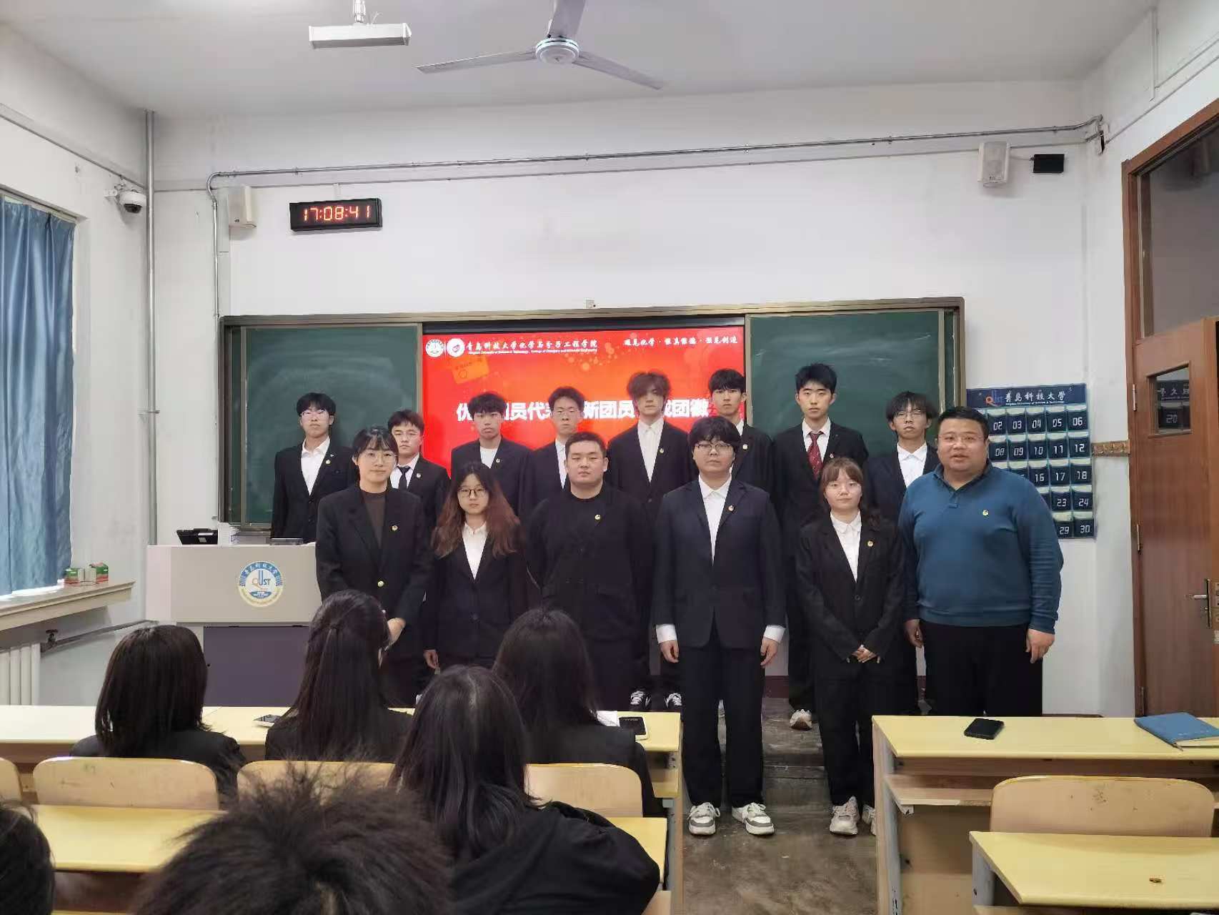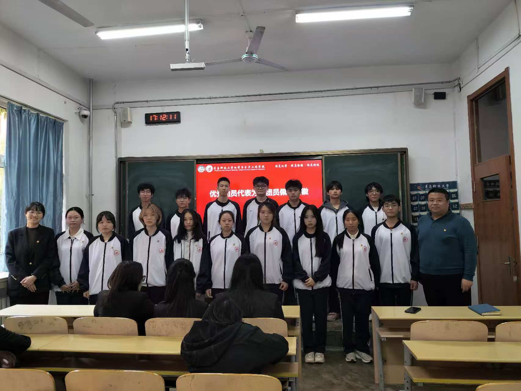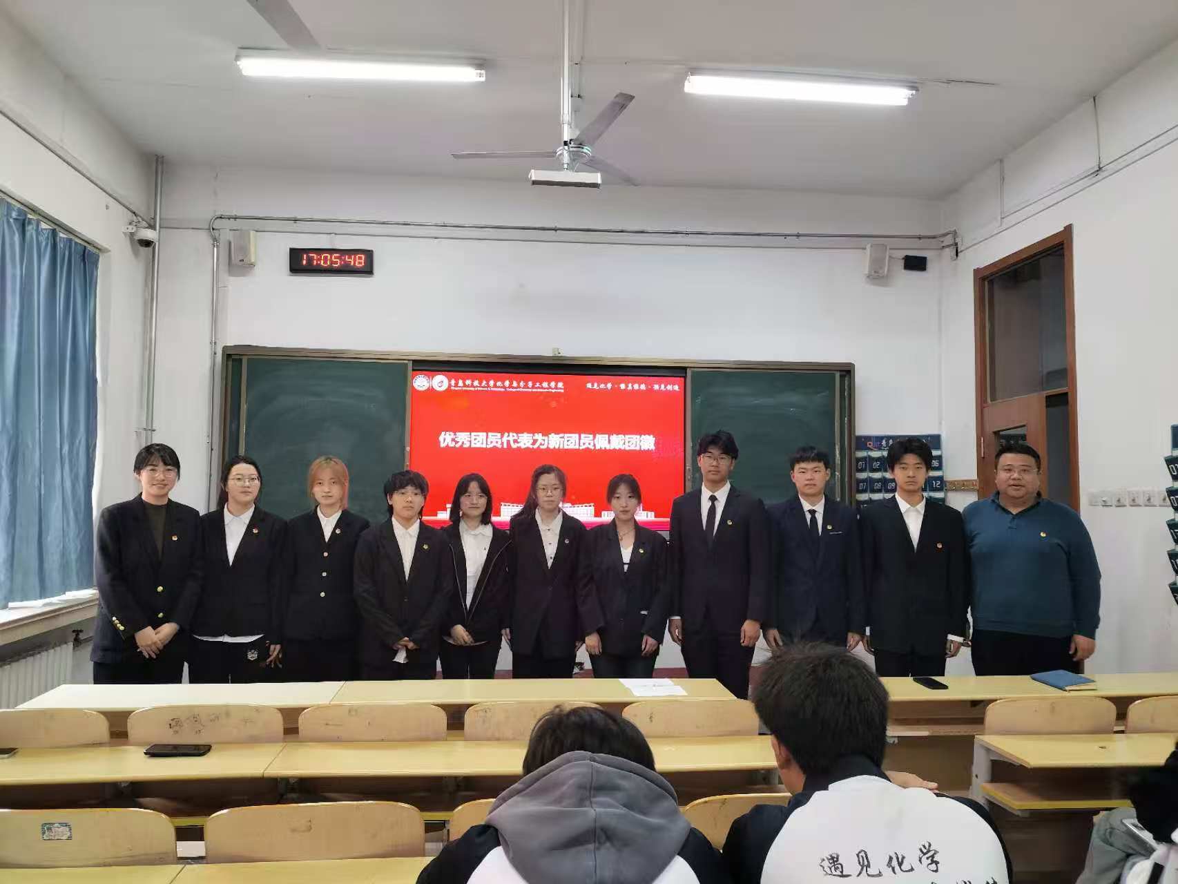 随后,陶亚亚介绍入团流程并宣读新发展团员名单,陶亚亚、信连涛、赵恩琦、张悦琳为新发展团员佩戴团徽,赵恩琦带领全体团员进行入团宣誓。郑默涵作为新发展团员代表发言,她表示,未来将以‘功成不必在我,功成必定有我’的担当,在课堂求知、在实践中成长,做有理想、敢担当、能吃苦、肯奋斗的新时代好青年。