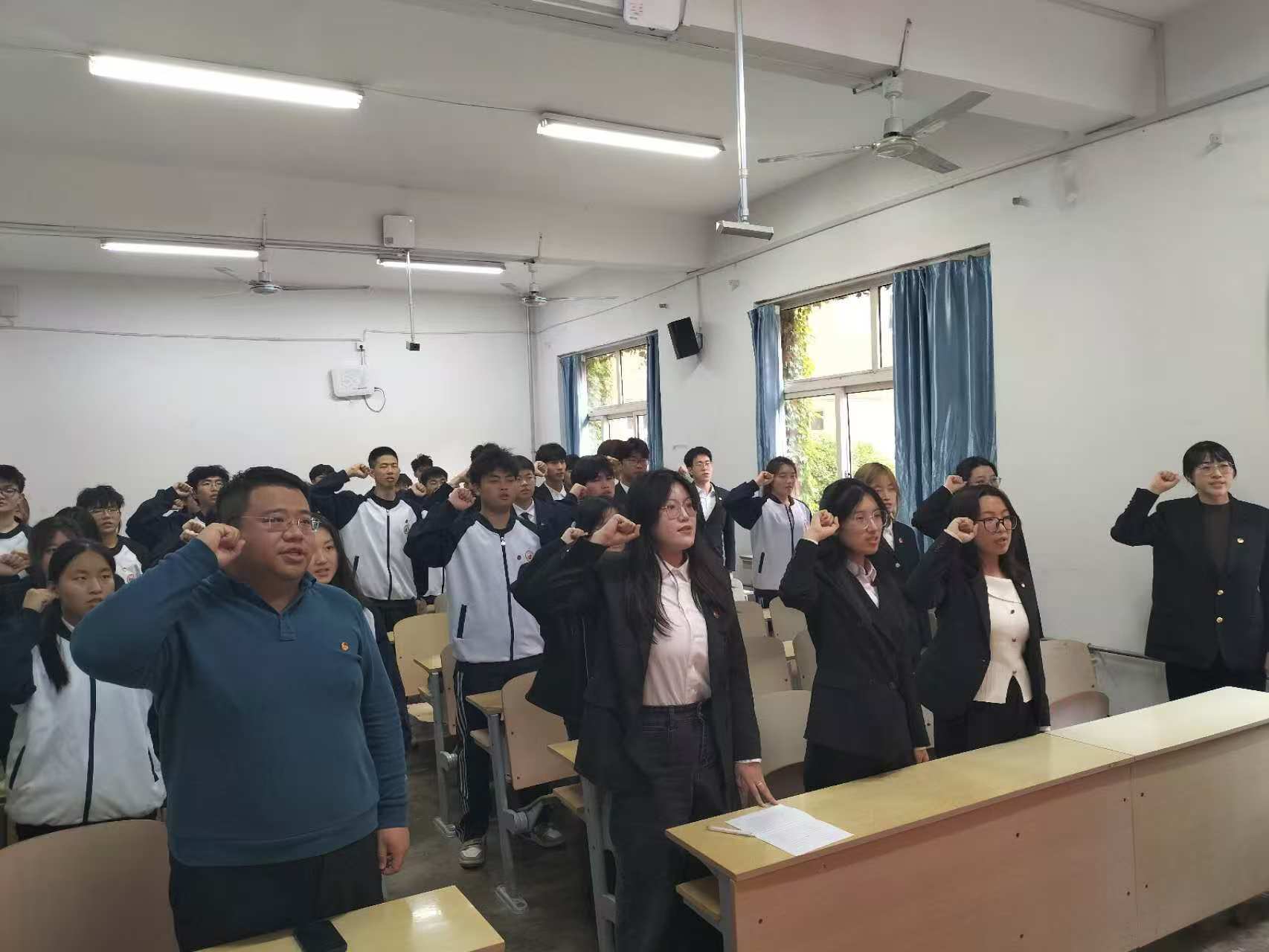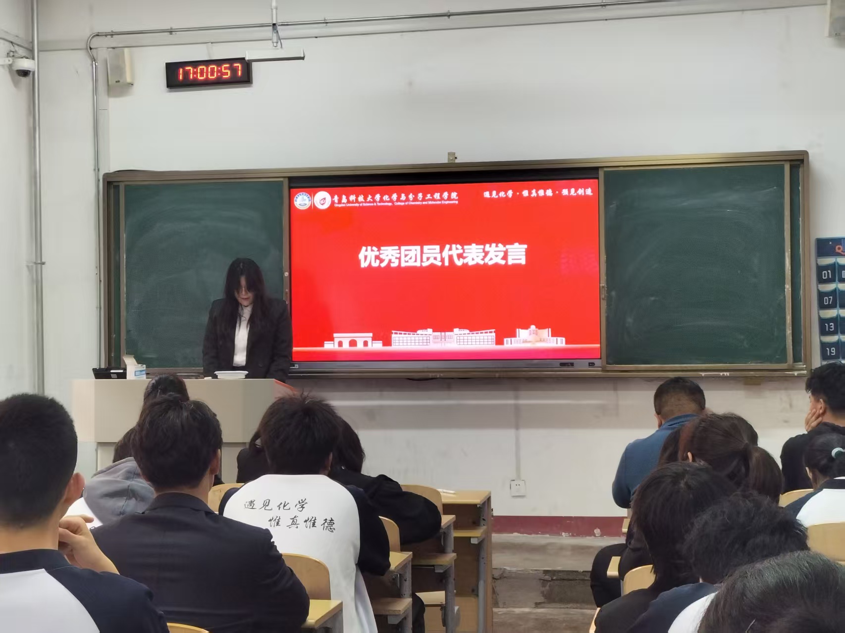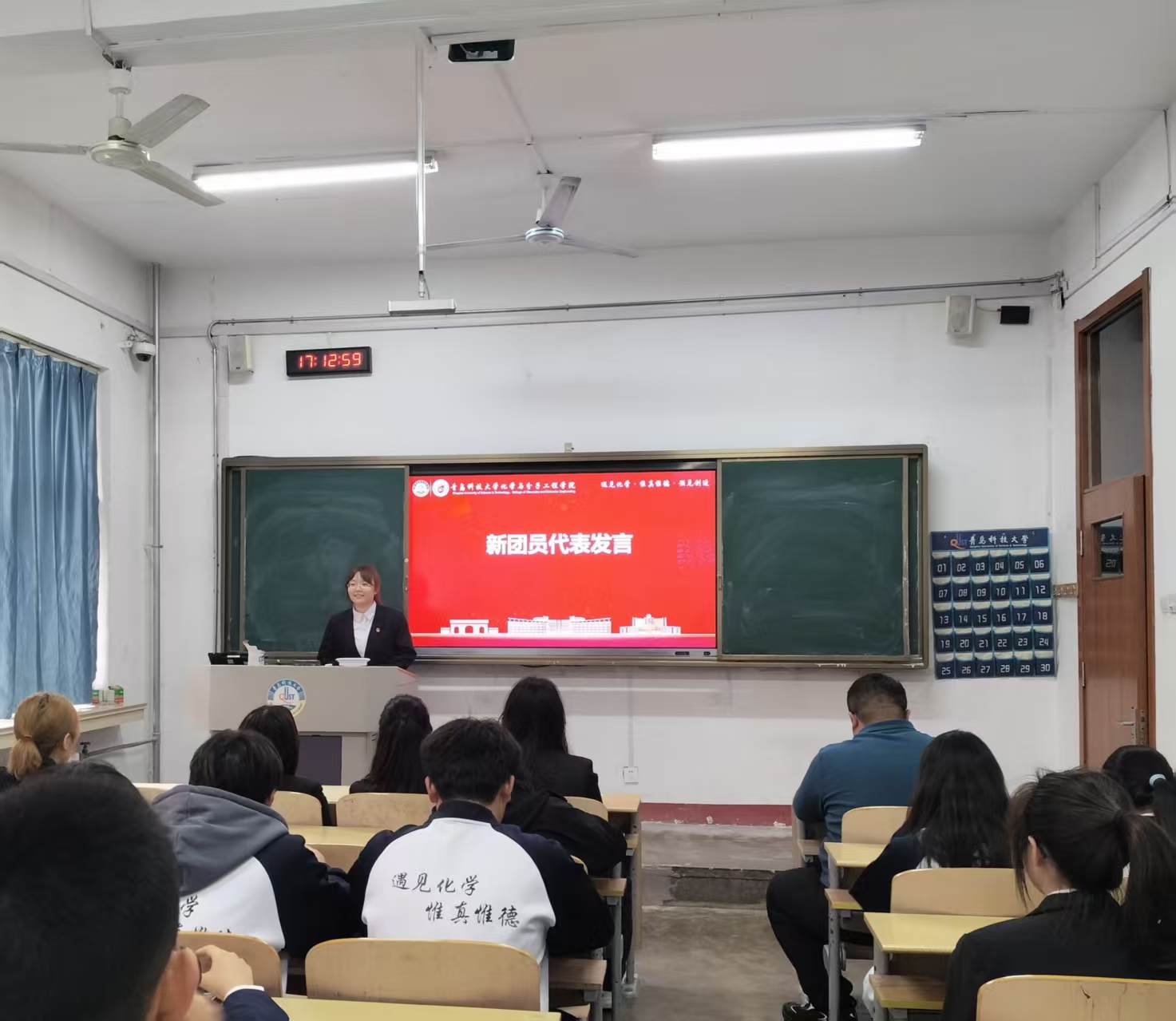 随后,陶亚亚介绍入团流程并宣读新发展团员名单,陶亚亚、信连涛、赵恩琦、张悦琳为新发展团员佩戴团徽,赵恩琦带领全体团员进行入团宣誓。郑默涵作为新发展团员代表发言,她表示,未来将以‘功成不必在我,功成必定有我’的担当,在课堂求知、在实践中成长,做有理想、敢担当、能吃苦、肯奋斗的新时代好青年。