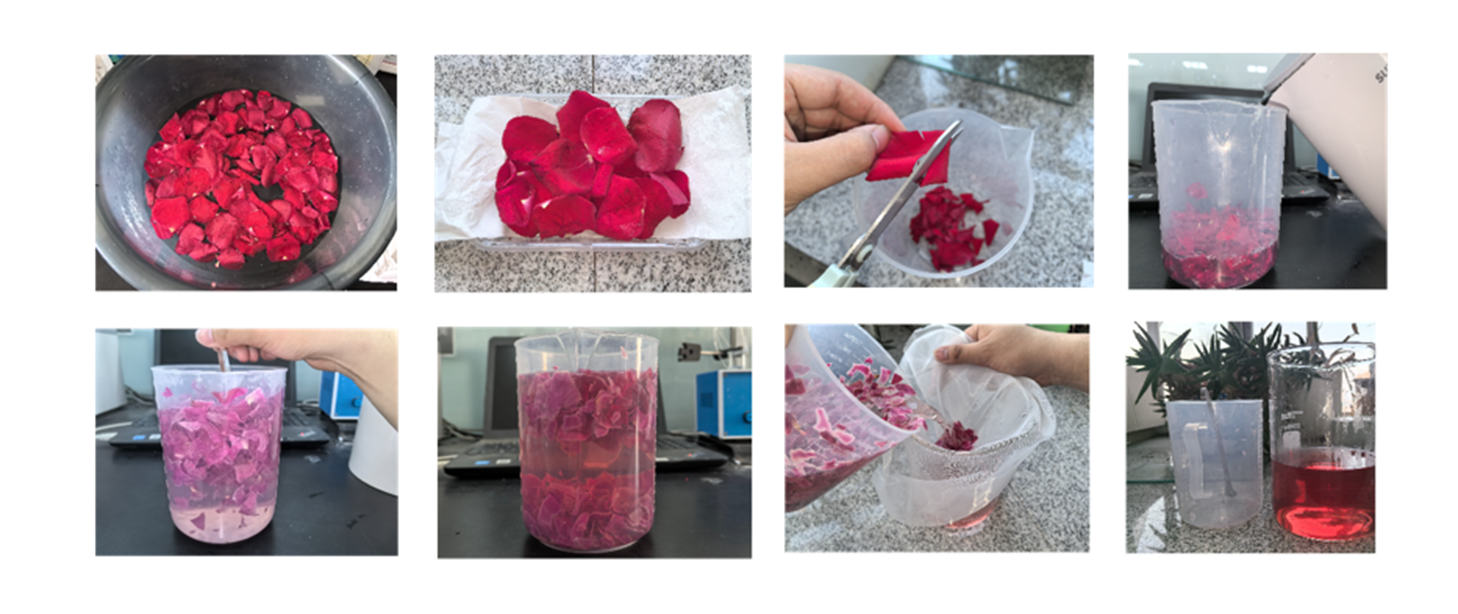 (1)原料预处理: 将玫瑰花花瓣瓣放入盆中,用流动清水轻轻漂洗2-3次,去除灰尘和昆虫(清洗去杂)。避免揉搓或长时间浸泡,防止色素流失。用剪刀将花瓣剪成碎片(或用菜刀切碎),增大接触面积(破碎处理)。 (2)花青素提取: 倒入准备好的热水,但避免加入的是高沸的沸水,防止高温破坏花青素(加入热水)。再向溶液中加入1汤匙白醋或半个柠檬挤汁,搅拌均匀,静置待玫瑰花瓣沉淀。用纱布或滤茶袋过滤,挤压花瓣残渣至无液体滴落。得到上层液体即为花青素粗提取液。