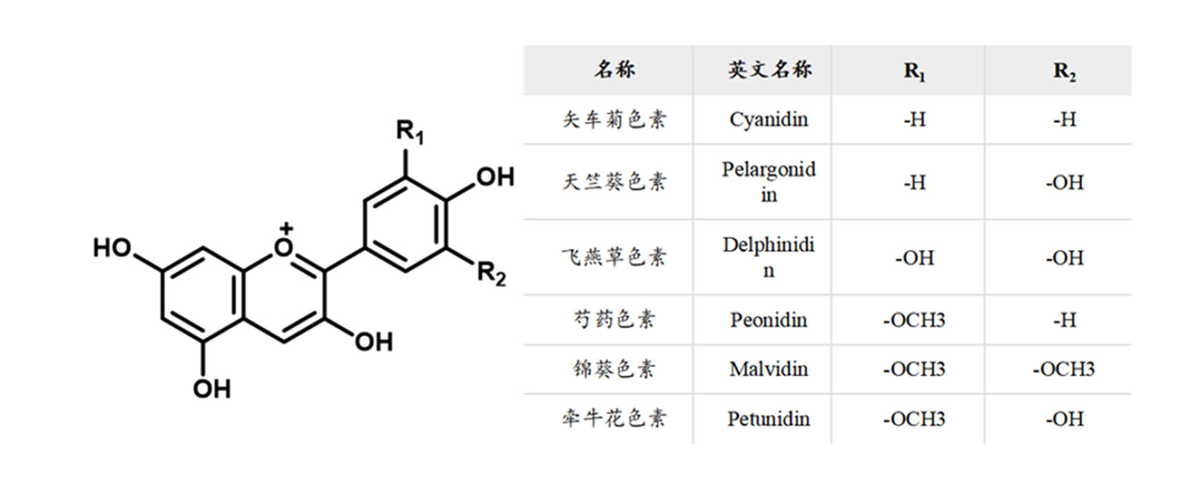 花青素最早由Marguart自矢车菊花瓣中分离获得,其在丙醇、乙醇、甲醇等有机溶剂中均具有良好溶解性。其分子以3,5,7-三羟基-2-苯基苯并吡喃为母核结构,通过羟基等取代基在苯环上的组合变化,衍生出多样化结构类型。[4]现已鉴定的天然花青素超20种,其中矢车菊色素、锦葵色素、芍药色素、天竺葵色素、飞燕草色素与牵牛花色素这六类占比超过自然界总量的90%,构成了植物显色的核心组分,如图1所示。