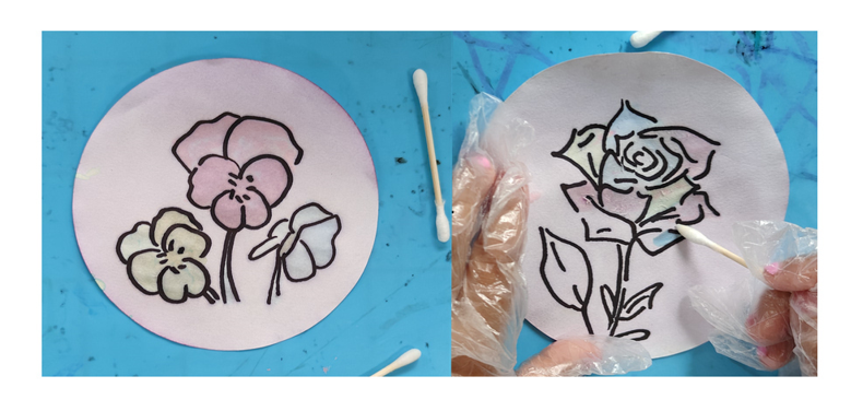 先将滤纸平铺在桌面上,用喷壶喷洒花青素提取液,均匀地喷涂在滤纸上,使滤纸表面布满花青素。待其稍干后,参与者使用毛笔蘸取不同pH值的溶液,在涂有花青素的滤纸上进行涂抹创作。涂抹不同pH值的溶液,滤纸会呈现出丰富多样的颜色变化,从而创作出独一无二的彩绘作品。