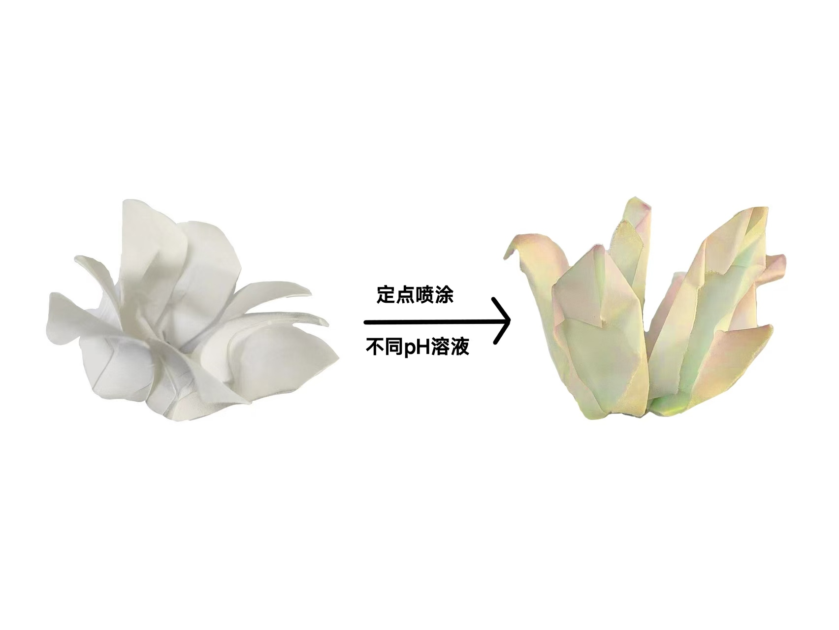 指导参与者用彩色皱纹纸制作纸花,用喷壶将花青素提取液均匀地喷洒在纸花上,此时纸花呈现出花青素本身的颜色。接下来,让参与者用装有不同pH值溶液的喷壶,依次喷洒在纸花上,观察纸花颜色随着酸碱环境变化而发生的奇妙改变。