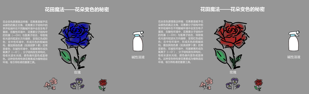 提前制作好与花青素科普相关的Flash互动动画。互动动画中设有科普知识区域,为使用者科普花青素变色原理,深入浅出的文字说明,配合上按钮互动与花朵颜色变化,使得科普更有趣味性,让使用者对科普内容的认识更加深刻。