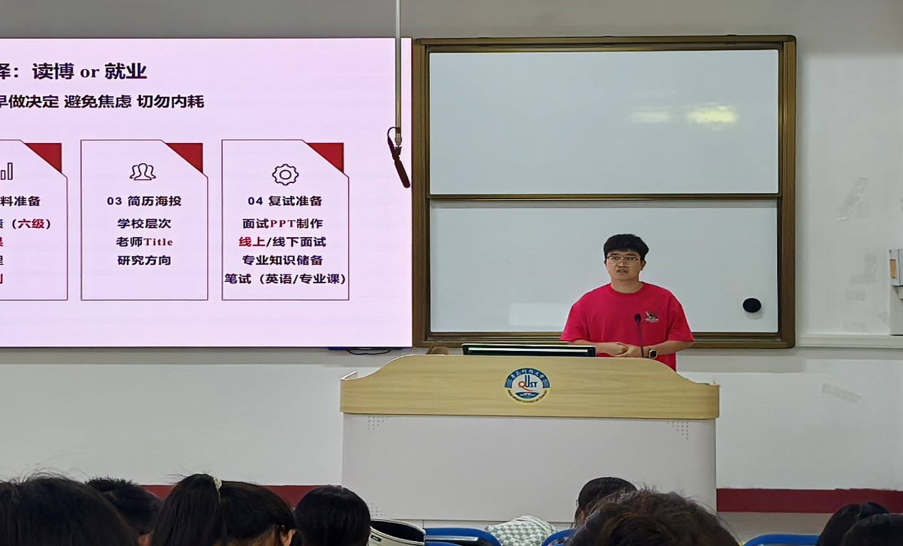 在分享会上,六位优秀毕业生结合自身经历,从不同角度进行细致讲解。在申请流程方面,王桢认真梳理申博关键时间节点,将其划分为前、中、后三个阶段,并从准备难度和准备时间两个维度梳理申博期间所需要递交的文书材料,为同学们提供有益的参考。院校选择策略上,韩晓阳从学术实力、地域优势、发展潜力三个层面筛选院校,并着重介绍如何获取目标院校核心信息及历年招生数据的方法。郭国菊则聚焦备考心理建设,分享“压力-动力转化模型”,引导同学们通过科学目标分解、高效时间管理及适度自我激励实现高效备考。