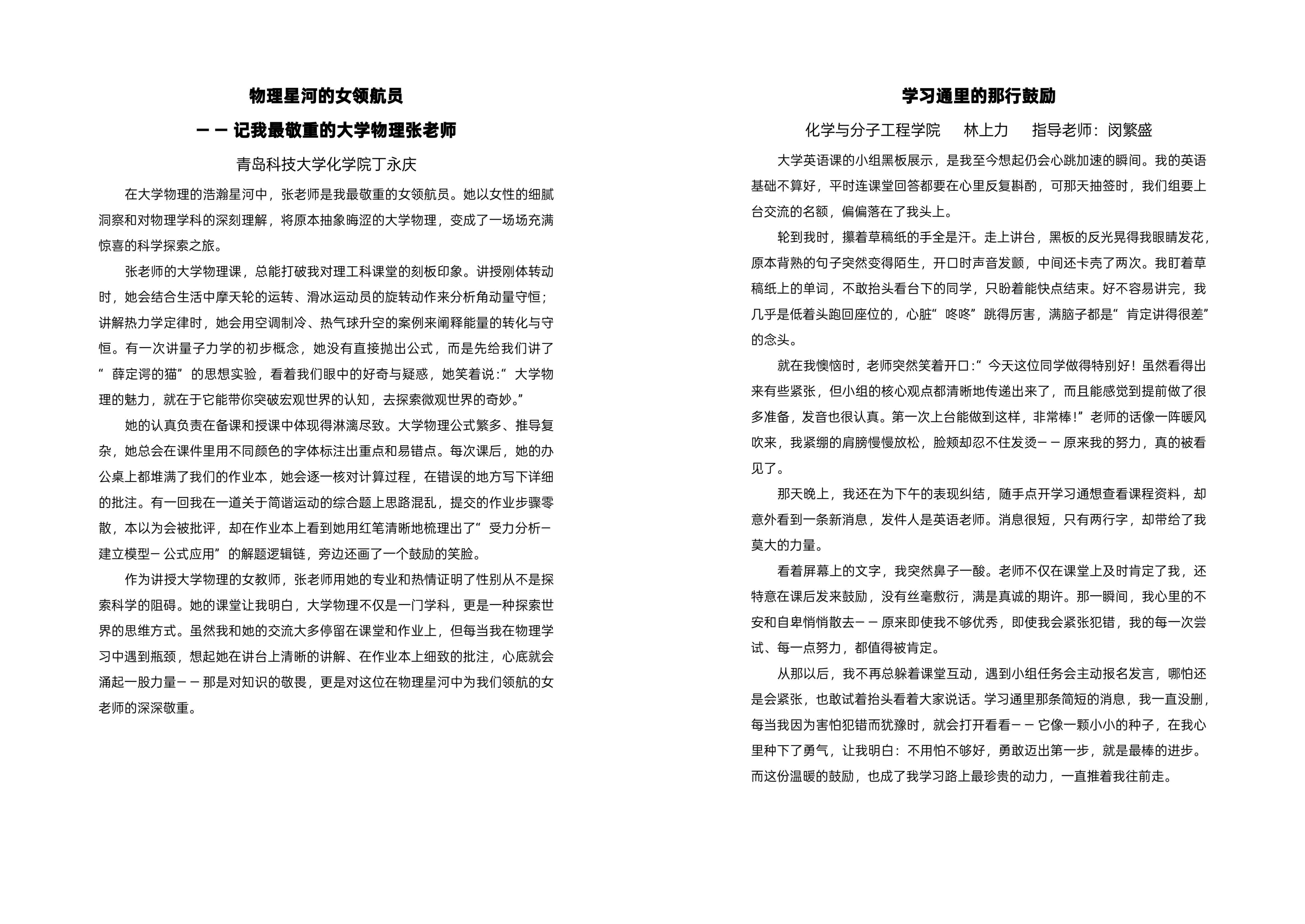 “笔下千言诉师恩,纸间万语道真情。”在“我最敬重的老师/我与老师的故事”征文比赛中,学生们踊跃投稿,用文字记录下老师的言传身教、暖心瞬间。一篇篇文章,如涓涓细流,流淌着化院学子对师恩的感念,更让这份跨越讲台的温情在文字中永恒。