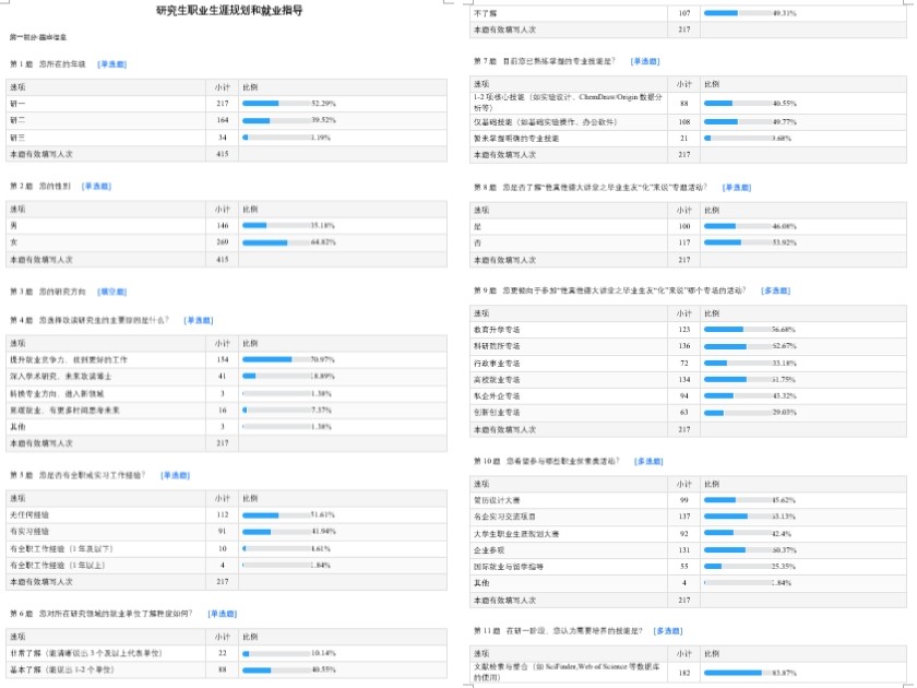 为精准聚焦同学们的求职与发展需求,持续优化升级“化育山海 青春化行”研究生就业助力项目,使其为同学们提供更精准、更有效的服务,2025年11月18日,学院研究生会开展研究生职业生涯规划与就业指导问卷调研活动。本次活动获得学院各年级研究生的积极响应,共回收有效问卷415份。