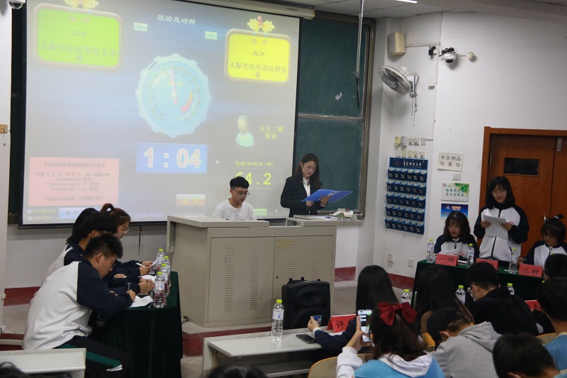 辩论赛分两场举行,第一场正方论点为“人际交往应该以义为重”,反方论点则为“人际交往应该以利为重”,双方对此辩题进行了激烈的辩论。在评委点评及讨论过后,认定反方略胜一筹,并一致认为正方一辩为最佳辩手。第一场结束后,在中间休息时间,同学们带来了精彩的才艺表演——贯口,表演同学流利的语言点燃了现场的气氛。第二场,双方以“网络匿名性对社会公共议题讨论有无利处“展开辩论,经过一辩陈词,驳论对辩,盘问小结,自由辩论及总结陈词阶段,双方不断驳论,立论,现场的氛围也逐渐的紧张起来。在评委讨论后本场辩论赛以反方胜利,正方四辩为最佳辩手结束。