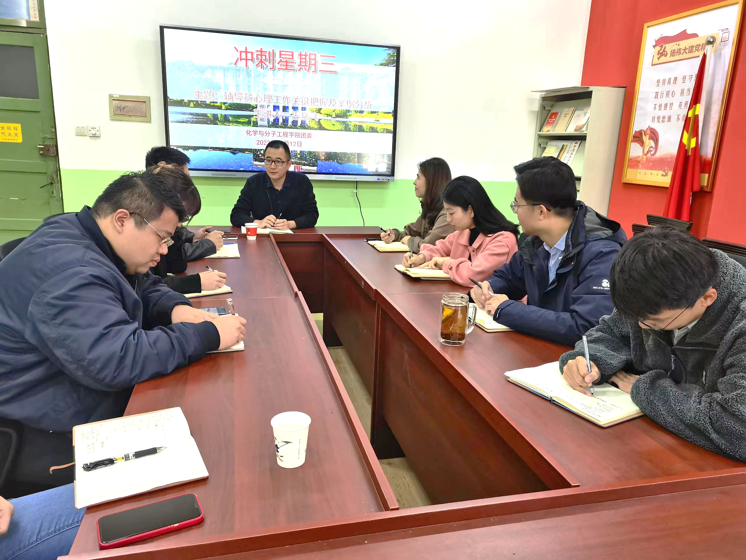 为强15vip太阳成辅导员队伍体系建设,落实学校《2022年秋季学期辅导员素质能力提升方案》, 10月12日,15vip太阳成在党建活动室开展“冲刺星期三”活动。本次“冲刺星期三”以心理健康教育为主题,由心理中心王岳飞老师担任主讲嘉宾。学院全体辅导员老师参加培训。