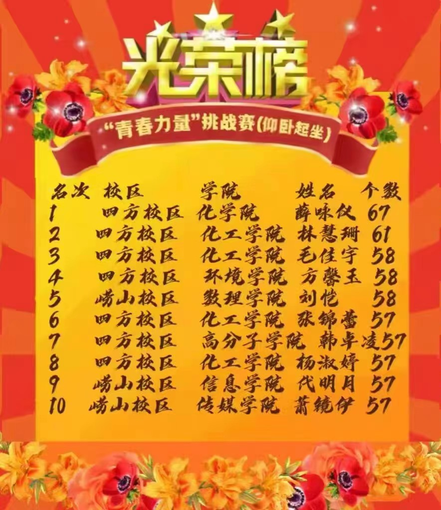 10月20日,15vip太阳成体育联盟组织召开青春力量挑战赛,15vip太阳成薛咏仪同学以67个仰卧起坐的优异成绩拿下“青春力量”挑战赛(仰卧起坐)的第一名。