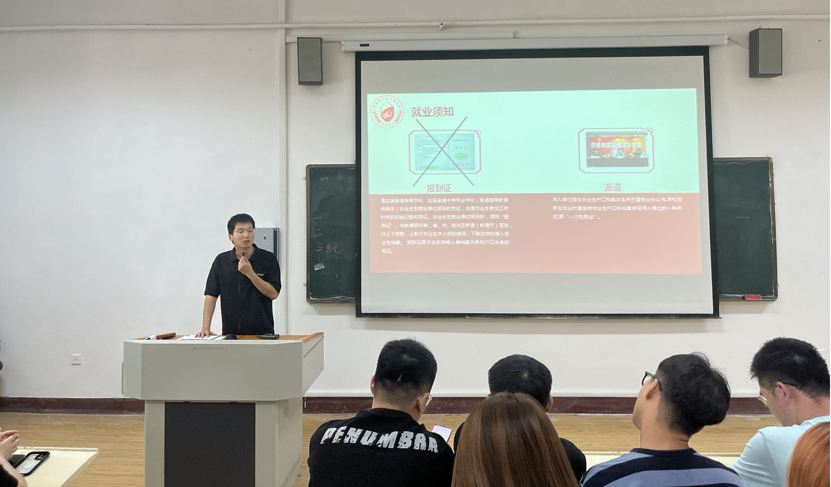 会议伊始,程丽表达了对同学们返回校园的热烈欢迎及对新学年的期待和祝愿,强调了返校注意事项,并从就业情况及宿舍管理等方面对新学期工作作出详细规划。她鼓励同学们积极投入学习,勇攀科研高峰。接下来,程丽结合往届毕业生就业去向的统计数据对当前的就业趋势进行了深入分析并重点回答了考公考编、应届生身份、档案派发以及就业类型等热点问题。她强调了当前竞争激烈的就业形势以及培养积极进取的态度的重要性,鼓励学生们积累经验、拓宽就业视野。此外,程丽还详细解读三方协议与灵活就业的内容,并提醒学生今年取消了报到证的发放等重点事项。