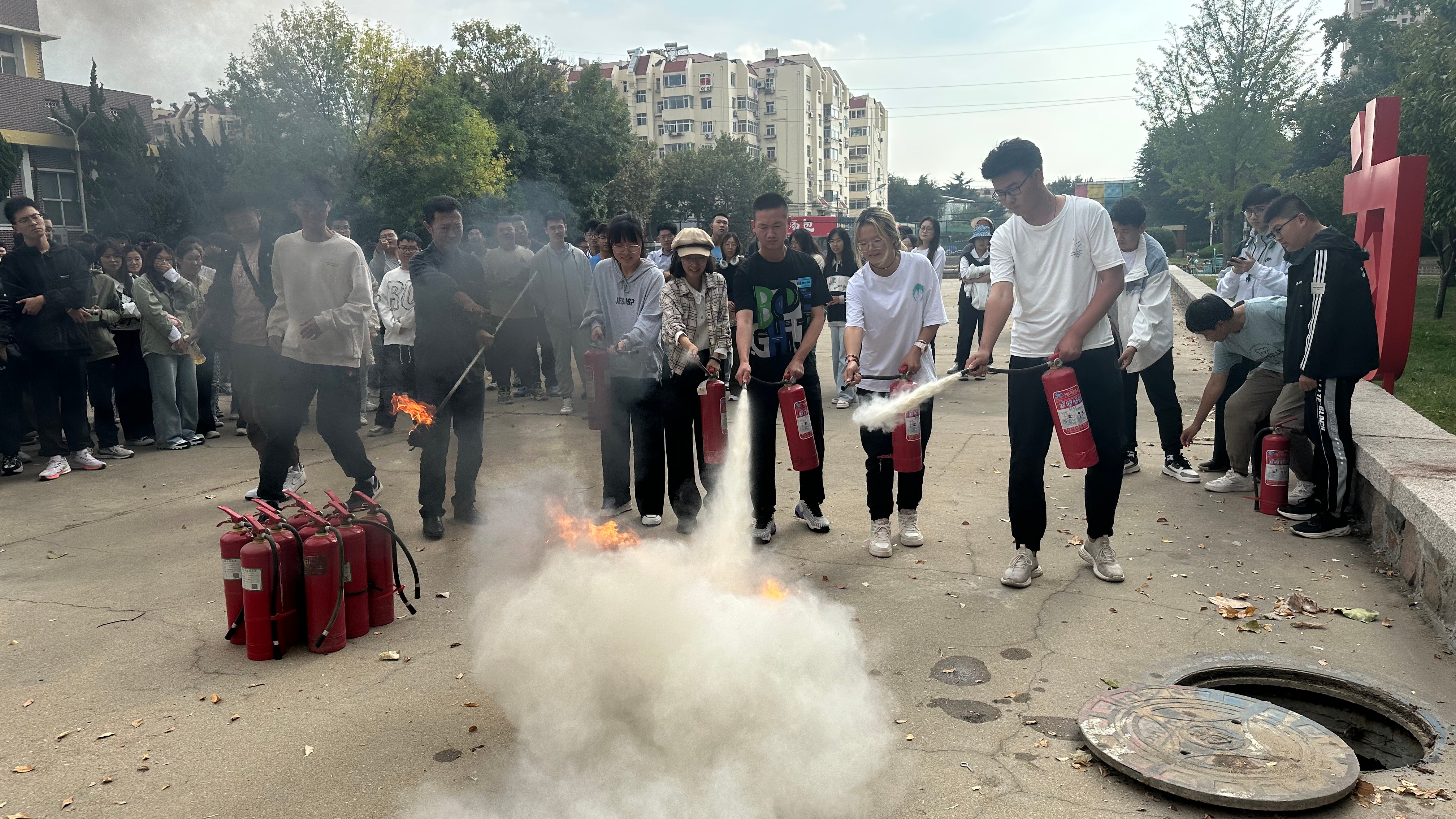在小五四广场进行的灭火器实操体验中,消防工作人员运用专业知识,向同学们讲解了火灾的等级、灭火器的种类及使用方法,并进行了消防栓灭火演示。随后,消防工作人员利用消防栓、汽油、火把等模拟了真实的火灾场景,让学生亲身感受火场的紧张和危险,并学习如何在火灾中迅速做出判断和应对。此外,在消防工作人员的专业指导下,2023级新同学实际操作了灭火器,达到了正确使用灭火器扑灭火情、发生火灾时懂得逃生自救的目的。