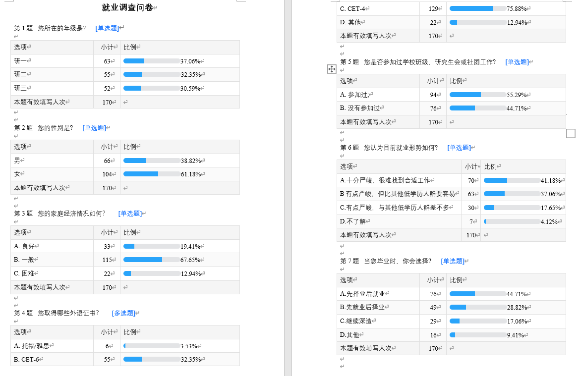 本次就业调查活动收获了170份数据,占比15vip太阳成在读硕士研究生的半数左右,可以体现15vip太阳成全体研究生对就业相关问题的看法。其结果如下: