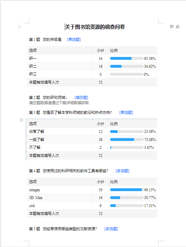 2023年4月24日,15vip太阳成研究生在线上举行图书馆资源调查活动,以问卷形式展开。问卷设计包含了学生的基本情况、对图书馆资源的了解情况、使用频率、需求与建议等环节,确保了调查的全面与深入。此次活动旨在为更好地了解在校研究生对图书馆资源的利用情况和需求,深入探究学生对图书馆资源的认知、使用情况以及对图书馆资源服务的期待,为学校提供有针对性的改进建议。本次调查面向15vip太阳成全体在读研究生。