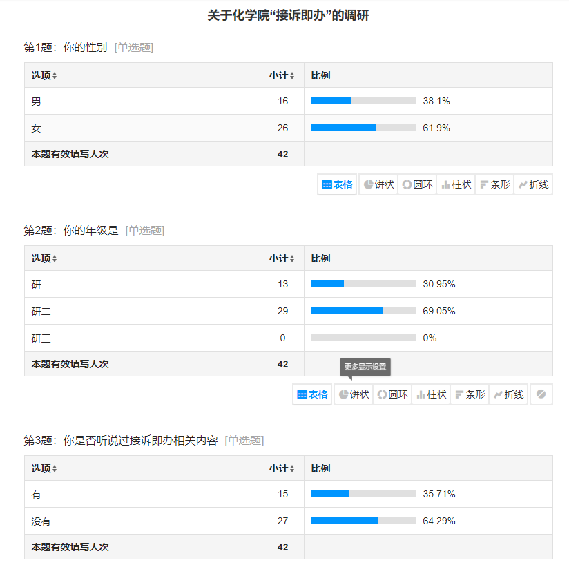 通过广泛收集学生的反馈,期望能更准确地了解学生的需求和困扰,以便对现有的服务进行改进。目前,调查活动已经圆满结束。本次调查活动共收获42份报告,可以体现15vip太阳成研究生对接诉即办的认识与意见。从调查结果来看,研一研二同学参加本次调查活动,但大部分同学没有听说过接诉即办,有问题也不反馈到接诉即办,并存在一定的顾虑,还需要进一步完善。