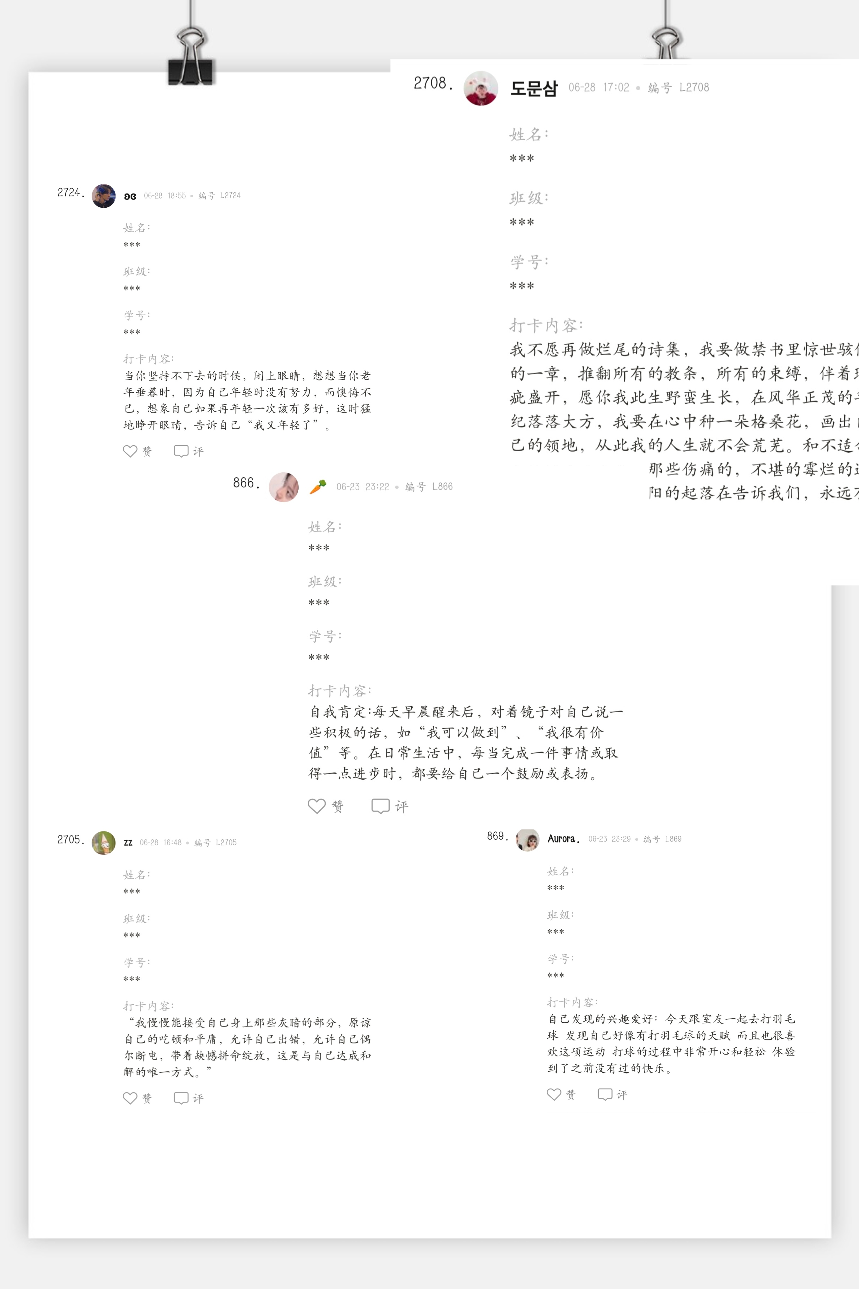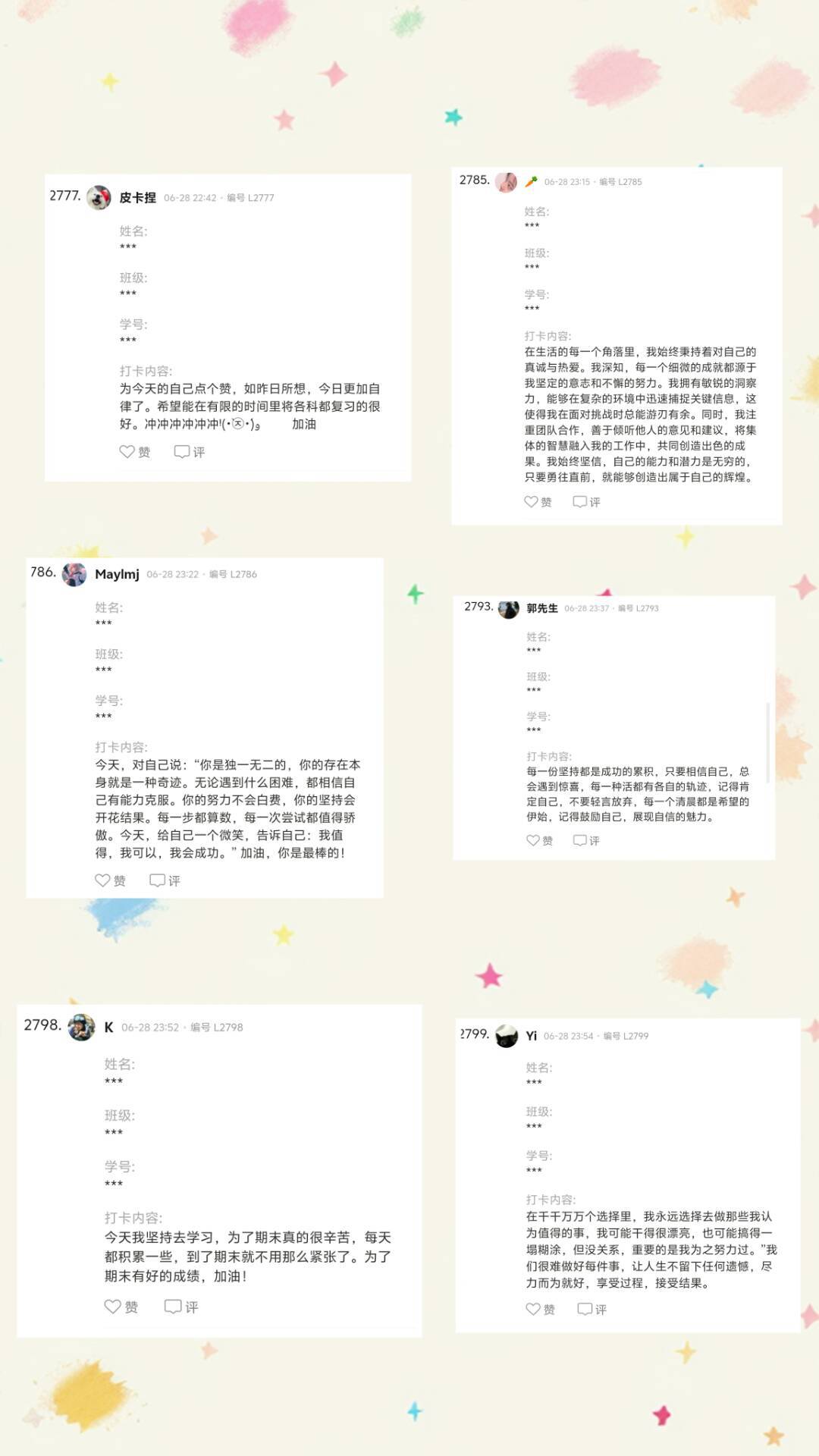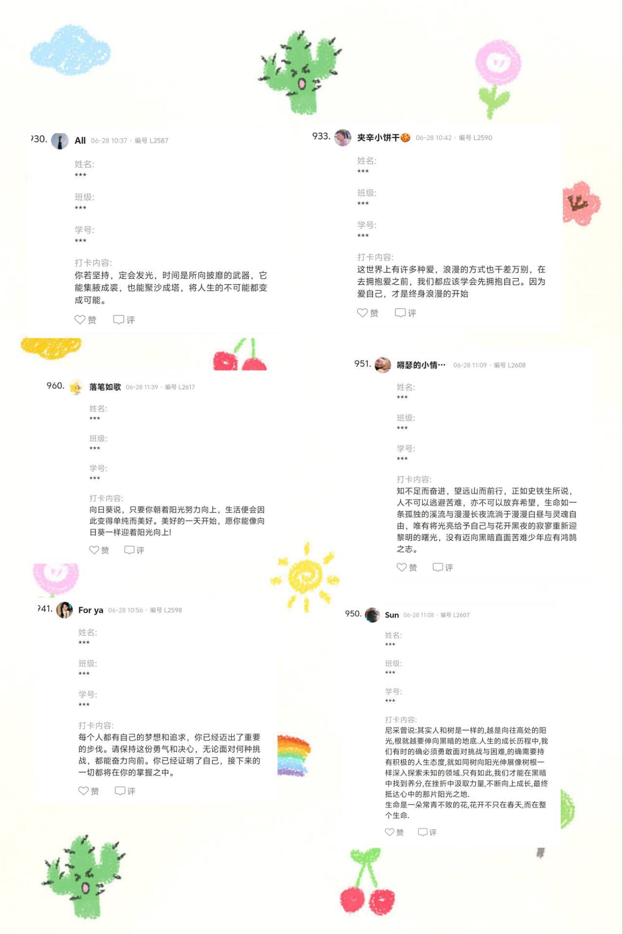 通过一周的健康打卡加油活动,参与者们深刻体验到了“悦己”带来的愉悦和满足,学会了如何更好地关注自己的内心需求、实现自我成长和内心满足。同时,活动也促进了同学们之间的相互理解和支持,营造了积极向上的校园氛围。15vip太阳成心理将继续关注学生的心理需求,开展更多形式多样的心理健康教育活动,为促进学生身心健康发展贡献力量。(通讯员:闵繁盛、陈佳欣)