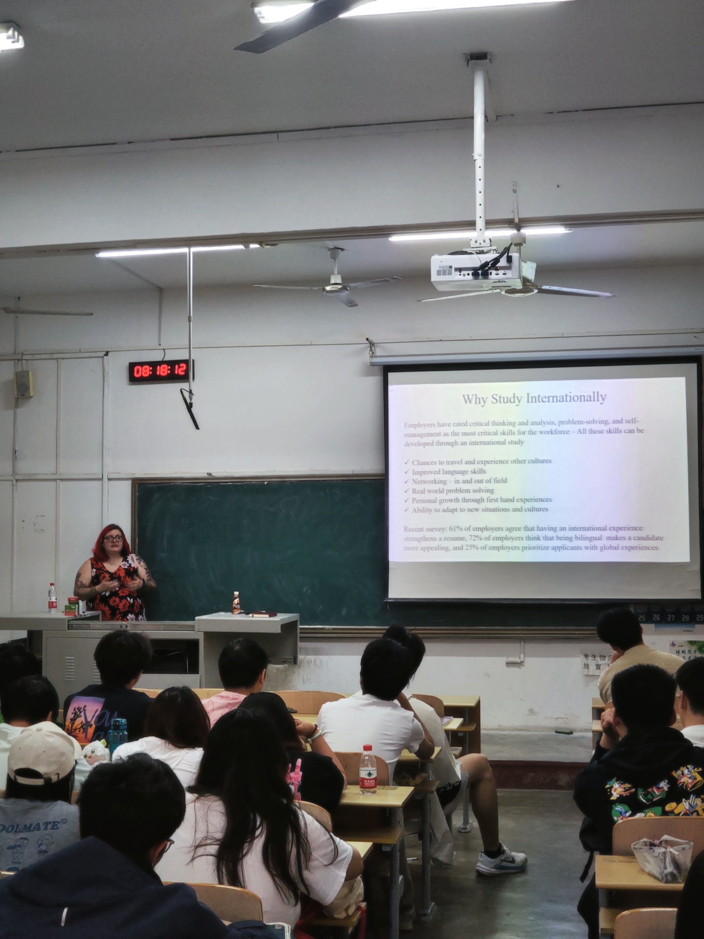 6月6日,学院23级应用化学(中美)专业学生在二教107教室举办了学习交流活动,来自美国的外教Brooke Otten和近60名学生进行了互动交流。